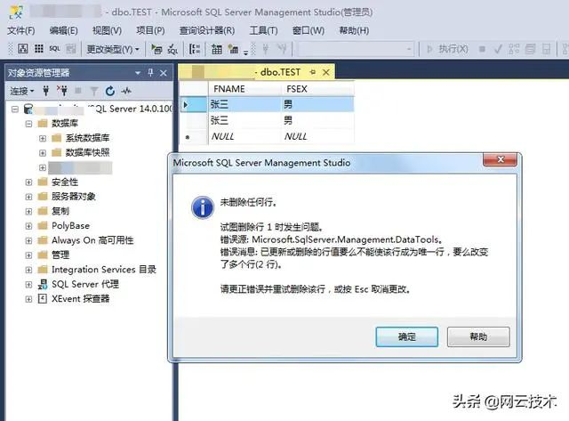 您满心欢喜的以为就这样搞定了,开心早了!您可能想不到的是,MSSMS提示您:完全一致的数据无法删除!如下图所示: