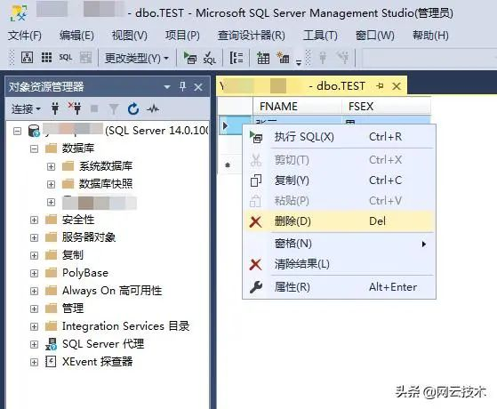 插进去容易,想要干掉却就难喽!如果您在MSSMS中想要删除这条记录,首先要打开表内容行列表,在某一行上单击鼠标右键执行删除菜单,如下图所示: