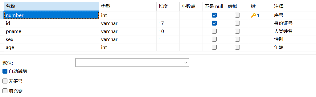 建表:把序号设为主键(主键是默认非空的),自动递增。