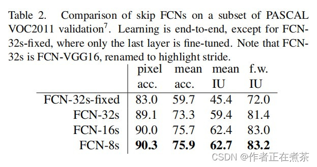 这篇论文还给出了 FCN-32s-fixed、FCN-32s、FCN-16s 和 FCN-8s 等模型的性能指标对比列表,具体如下: