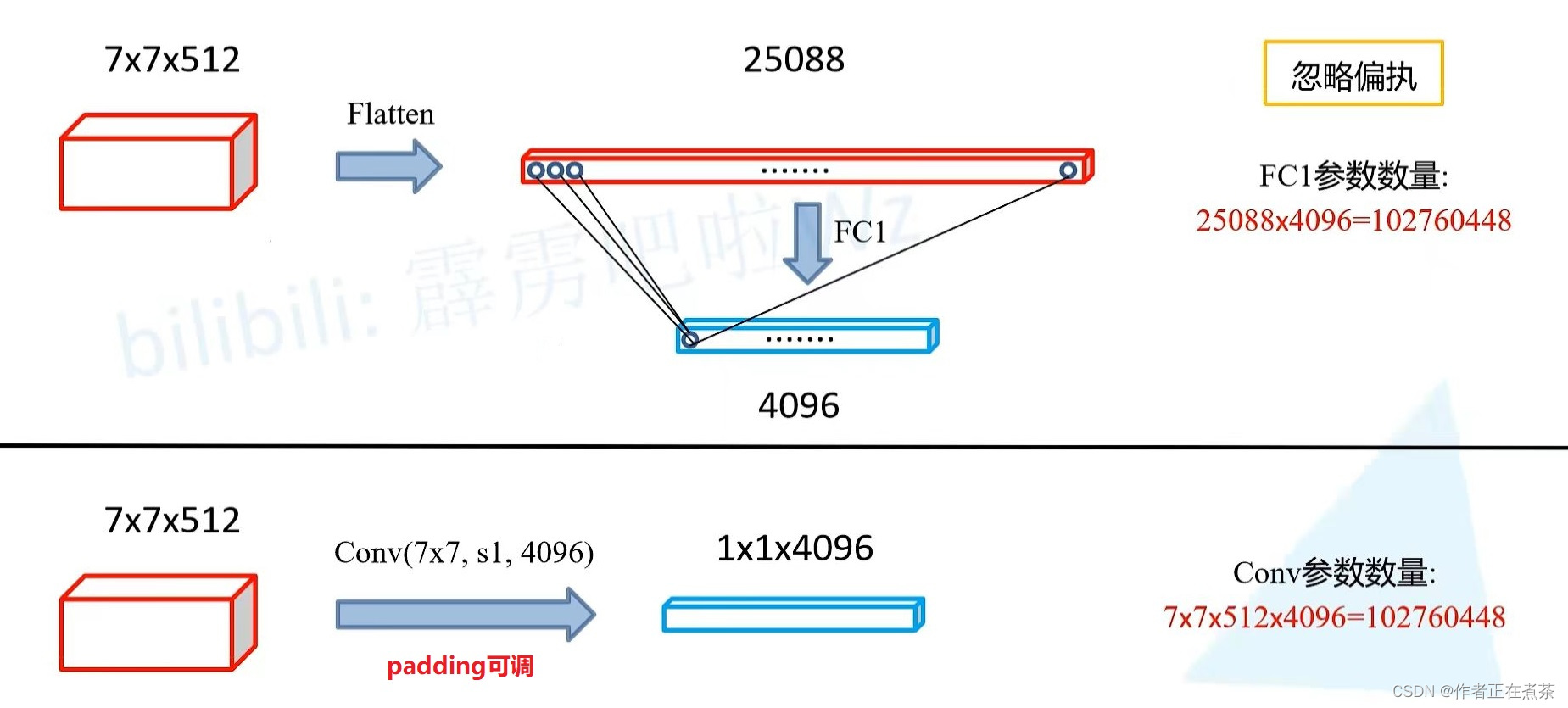 - 卷积层:对 7 x 7 x 512 的特征层进行 conv ( 7 x 7 , s1, 4096 ) 卷积操作后,Conv 参数数量为 7 x 7 x 512 x 4096 = 102760448