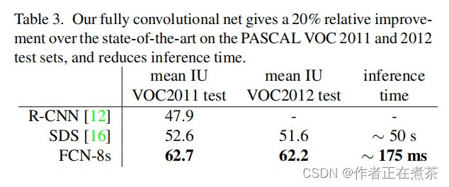 接着,作者基于 2011 与 2012 的 PASCAL VOC 测试数据集,将 FCN 网络与当年的主流网络进行对比,发现 FCN 网络的 mean IoU 提升了 20% ,且 推理时间 更短。具体的对比情况可以参考论文提供的这张表: