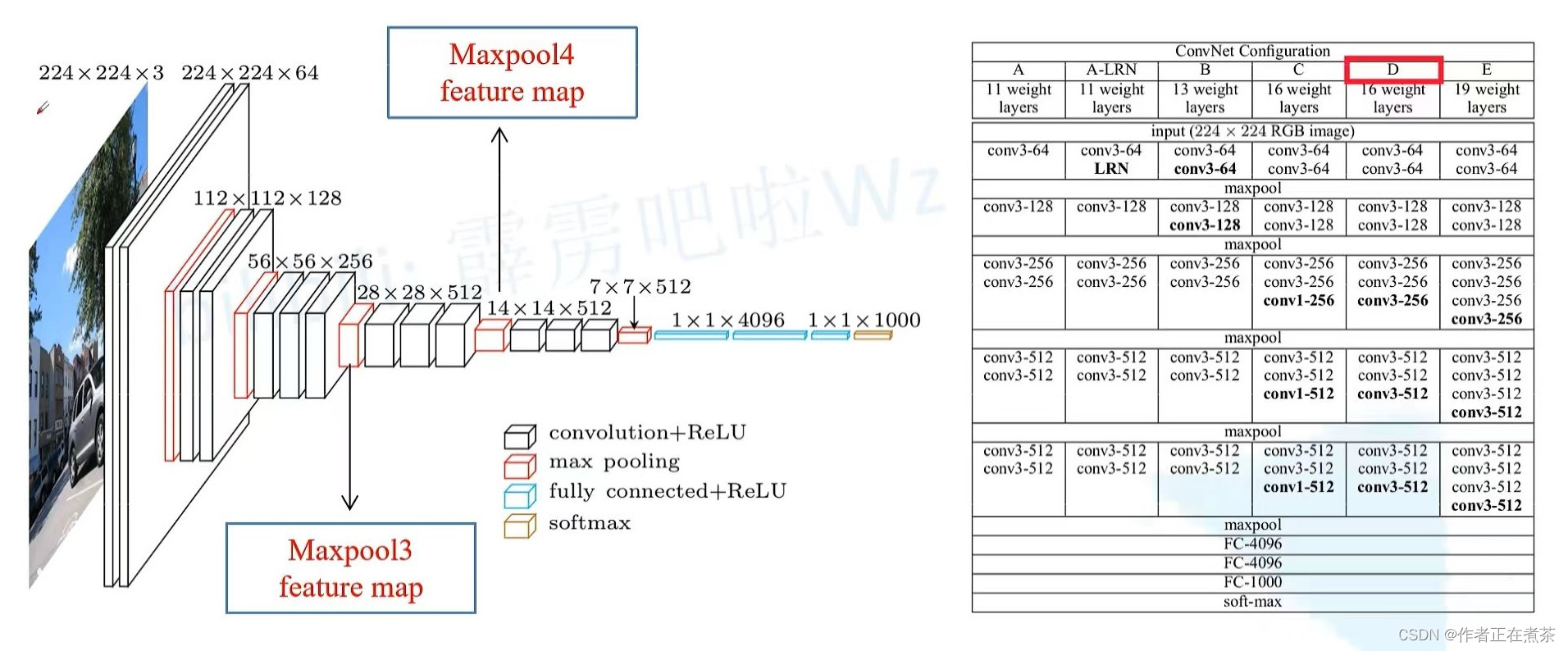 在 VGG16 网络模型中,通常使用 D 配置,输入图片经过这个网络模型后,从 224 x 224 x 3 至 7 x 7 x 512 ,下采样 32 倍,在经过三个全连接层,前两个全连接层对应的是 4096 个结点,第三个全连接层对应的是 1000 个结点。