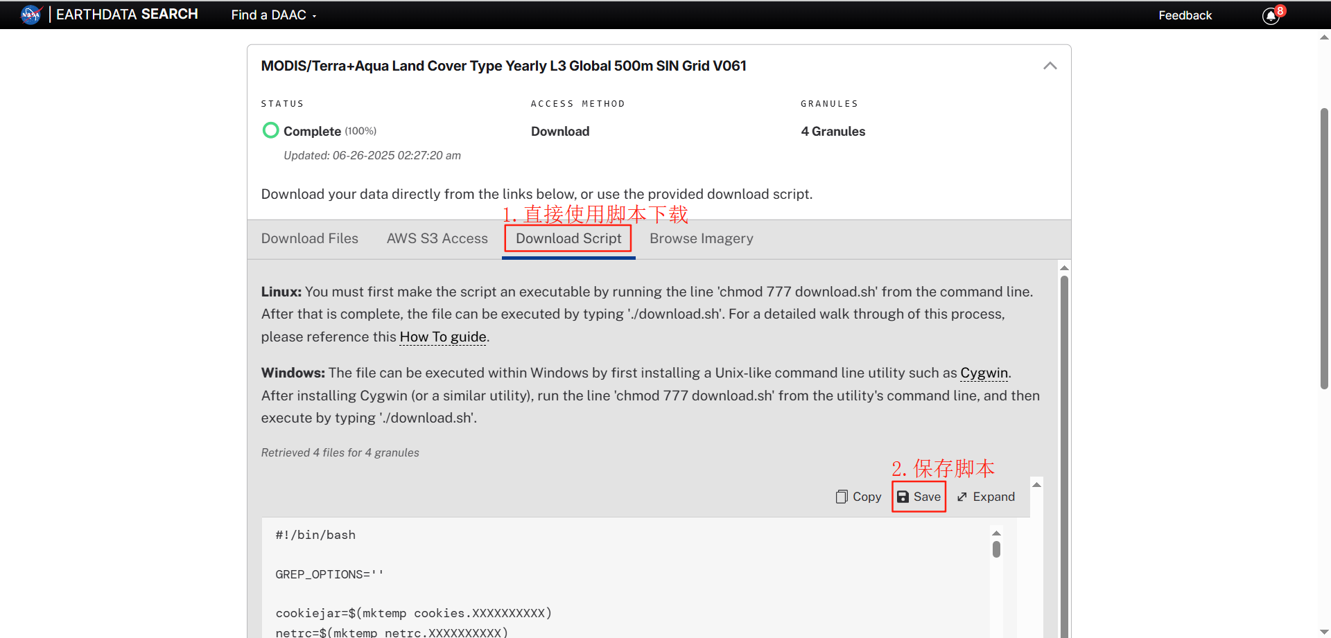 1.2 在命令行运行./*download.sh,输入用户名和密码,下载得到形如MCD12Q1.AYYYYDDD.hHHvVV.CCC.YEARDAYHRMNSC.hdf的文件
