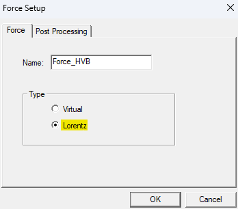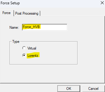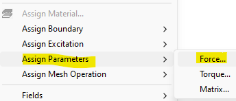 要为对象分配洛伦兹力参数,请选择该对象,然后在项目管理器中右键单击“参数”,然后选择“分配”并选择“力”。或者,我们可以选择对象,右键单击模型窗口,选择“参数”,然后选择“力”。涡流解算器和磁瞬态解算器允许用户为力参数选择“洛伦兹力”或“虚拟力”,而静磁解算器则提供了使用虚拟力的选项。洛伦兹力参数用于由“非磁性材料”制成的物体,虚拟力用于由“磁性材料”制成的物体。