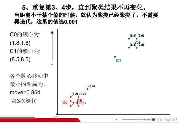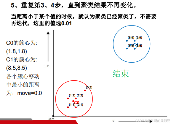 - 重新计算簇心:C0 还是 (1.8,1.8),C1 还是 (8.5,8.5),簇心移动距离 = 0(小于 0.01)。