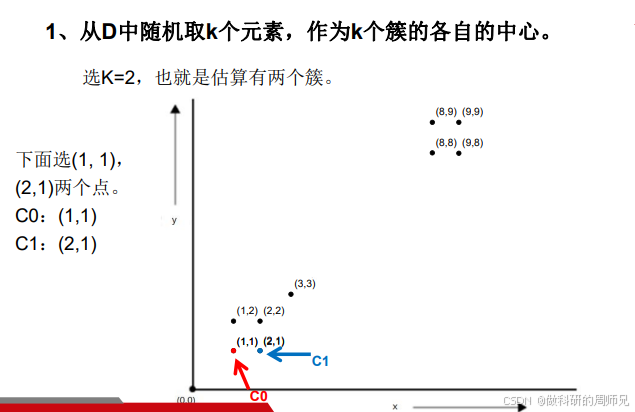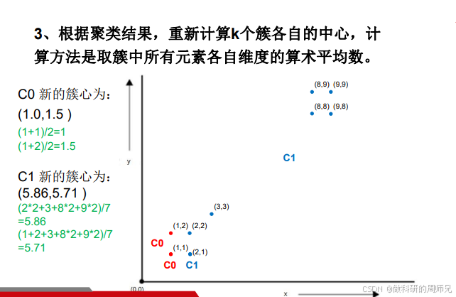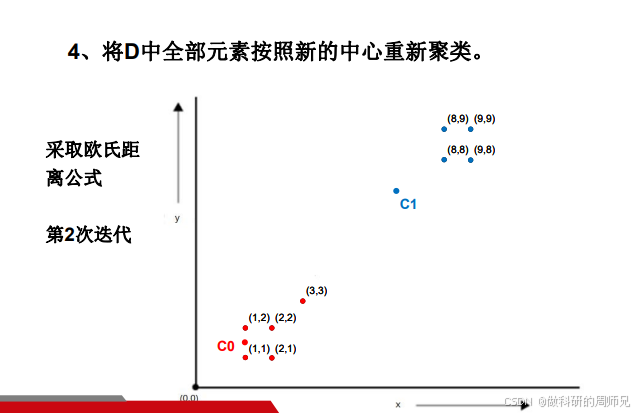 - y 总和:1+1+2+2 = 6 → 均值 = 6/4=1.5; 哦?不对,参考例子中的计算,第一次迭代后 C0 的新簇心是 (1.0,1.5),可能是步骤 2 的划分略有不同 —— 重新核对:如果初始簇心 C0 (1,1)、C1 (2,1),点 (2,1) 本身是 C1 的初始簇心,所以步骤 2 中 C0 的点应该是 (1,1)、(1,2),C1 的点是 (2,1)、(2,2)、(3,3)、(8,8)、(8,9)、(9,8)、(9,9)(共 7 个点),这样计算更贴合例子: