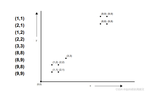 - 数据点:9 个二维坐标,分别是 (1,1)、(2,1)、(1,2)、(2,2)、(3,3)、(8,8)、(8,9)、(9,8)、(9,9)(可以想象成平面上的 9 个点,明显分成两堆:左下一堆 “小坐标点”,右上一堆 “大坐标点”);