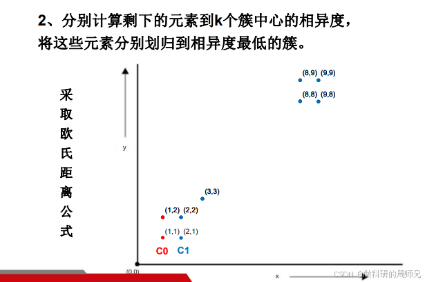 对剩下的 7 个点(除了两个初始簇心),分别计算它们到 C0、C1 的欧氏距离,距离哪个簇心近,就归到哪个簇。