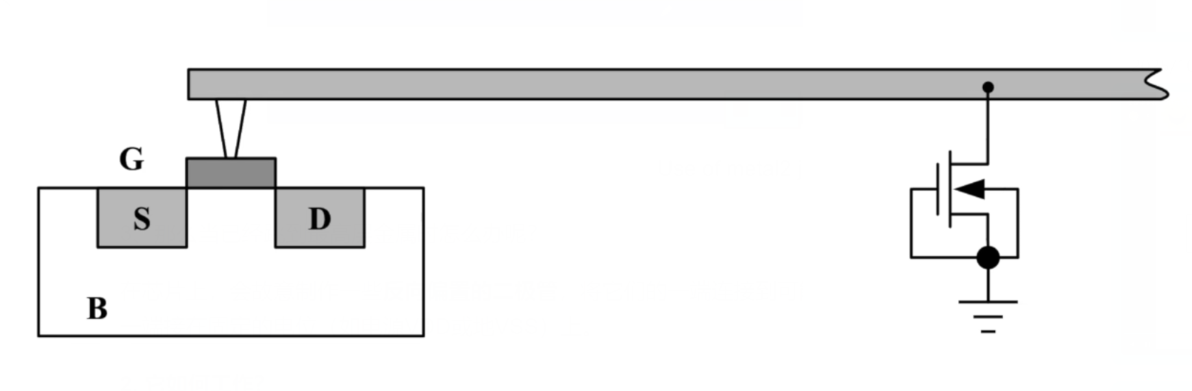 在芯片上,会故意制作一些反向偏置的二极管(二极管的反向击穿特性),将它们的一端连接到可能成为天线的金属线上,另一端接在固定的电位,电源VDD或地VSS上。