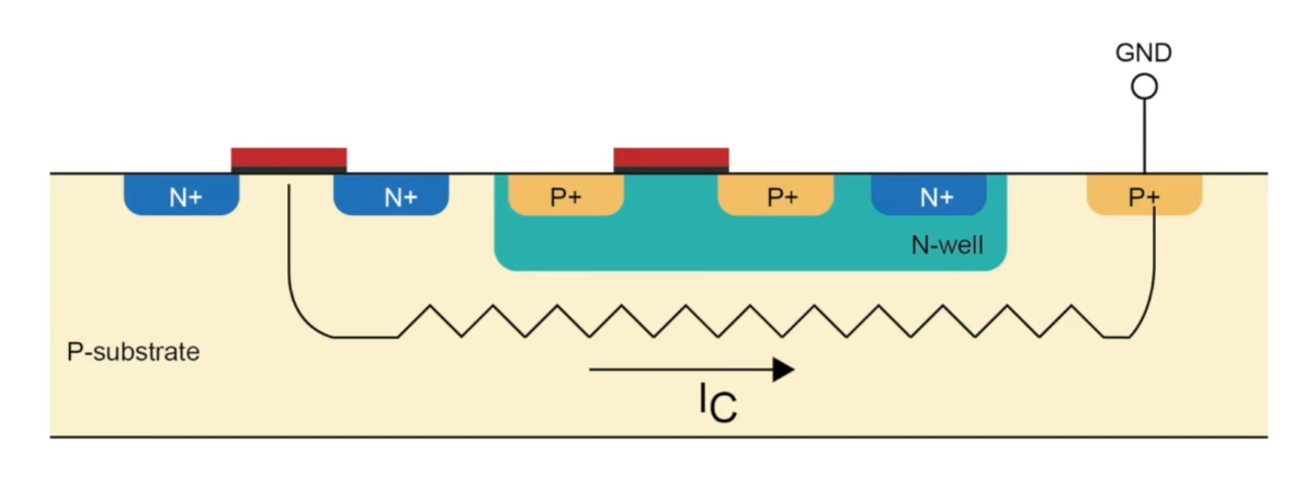 MOS管的PN之间天然存在着寄生二极管,且衬底本身不是理想导体,他存在寄生电阻;当电路稳定工作时,衬底通过衬底接触孔与固定电位(VDD/VSS)连接,所有寄生二极管都处于反向偏置状态,相当于断开;当芯片内部发生一个瞬时的大电流事件时(大量数字门电路同时开关/同步开关噪声/反相器),如果衬底接触孔数量不足或分布不均,这个大电流流过衬底的寄生电阻时,就会根据欧姆定律 V = I * R,在衬底内部产生一个显著的瞬时电压降。