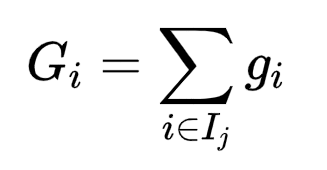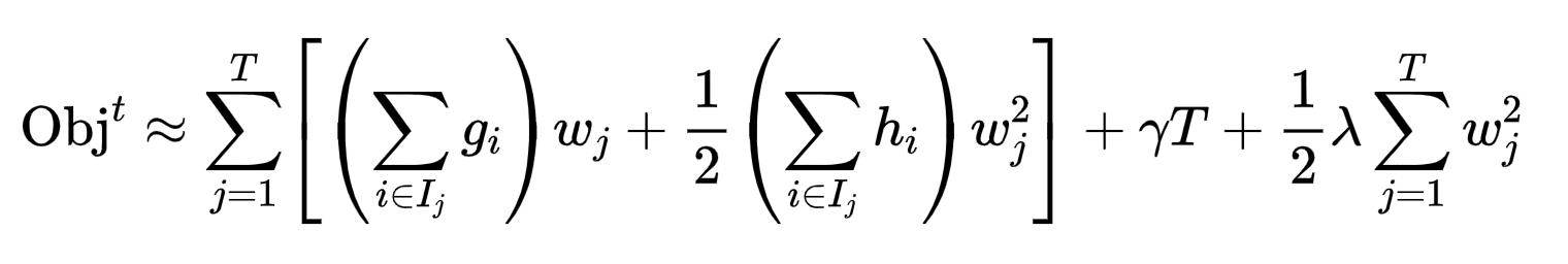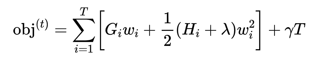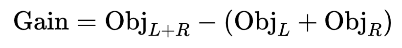 该公式也叫做打分函数 (scoring function),从损失函数、树的复杂度两个角度来衡量一棵树的优劣。当我们构建树时,可以用来选择树的划分点,具体操作如下式所示: