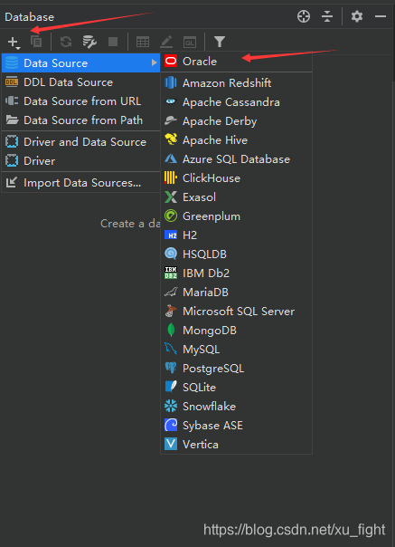 3.此时会出现Database页面,点击左上角‘+’创建Oracle数据库连接