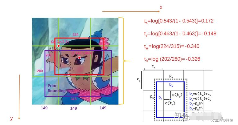 - 1. 检测到的不是框而是偏移量: tx,ty指的是针对所在grid的左上角坐标的偏移量, tw,th指的是相对于anchor的宽高的偏移量,通过如下图的计算方式,得到bx,by,bw,bh就是最终的检测结果。