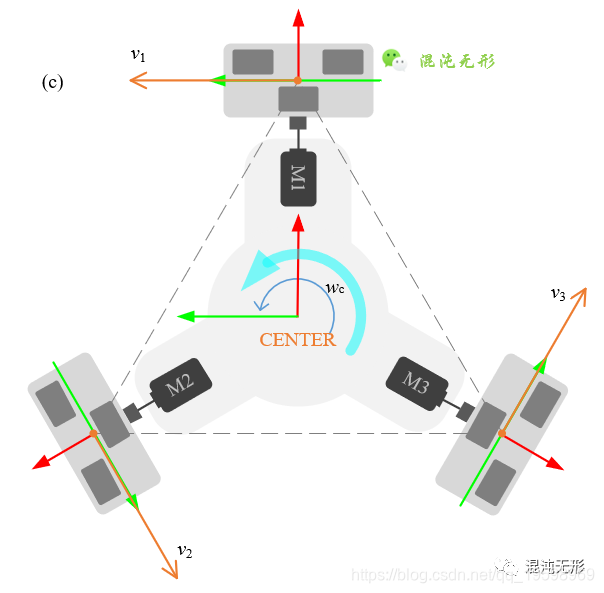 关注同名微信公众号“混沌无形”,阅读更多有趣好文!原文链接:https://mp.weixin.qq.com/s/d6EKLlen4gF8Eoat8eSFvQ(包含原文PDF百度云下载链接)逆时针自旋运动:以图 2.2(c)为例,所有全向轮均正转,即所有全向轮的速度方向均沿着圆ABC的切线方向,且朝向逆时针方向。若将三个全向轮的速度矢量[v1v2v3]的起始点平移至点CENTER,那么三个速度矢量