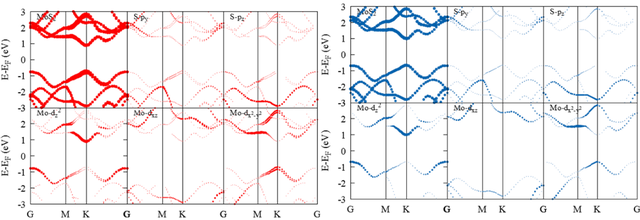 为了更加详细的分析的各个轨道的电子在能带中的分布,可以通过计算MoS2各个原子的各个轨道对能带的贡献情况(球的大小表示贡献权重)如图4所示。Mo原子在界面处的杂化态最为显著。从图中可以看出MoS2的VBM和CBM主要来源于Mo原子的k点的和轨道,其次Mo原子的轨道G点也有着部分的电子贡献,与态密度的计算结果一致。