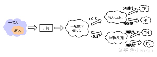 TP/FP/FN/TN组合,第一个字母表示算法预测的对错,也就是是否和实际情况相符,T表示正确,F表示错误。第二个字母表示算法预测的结果,P为正例,N为负例.