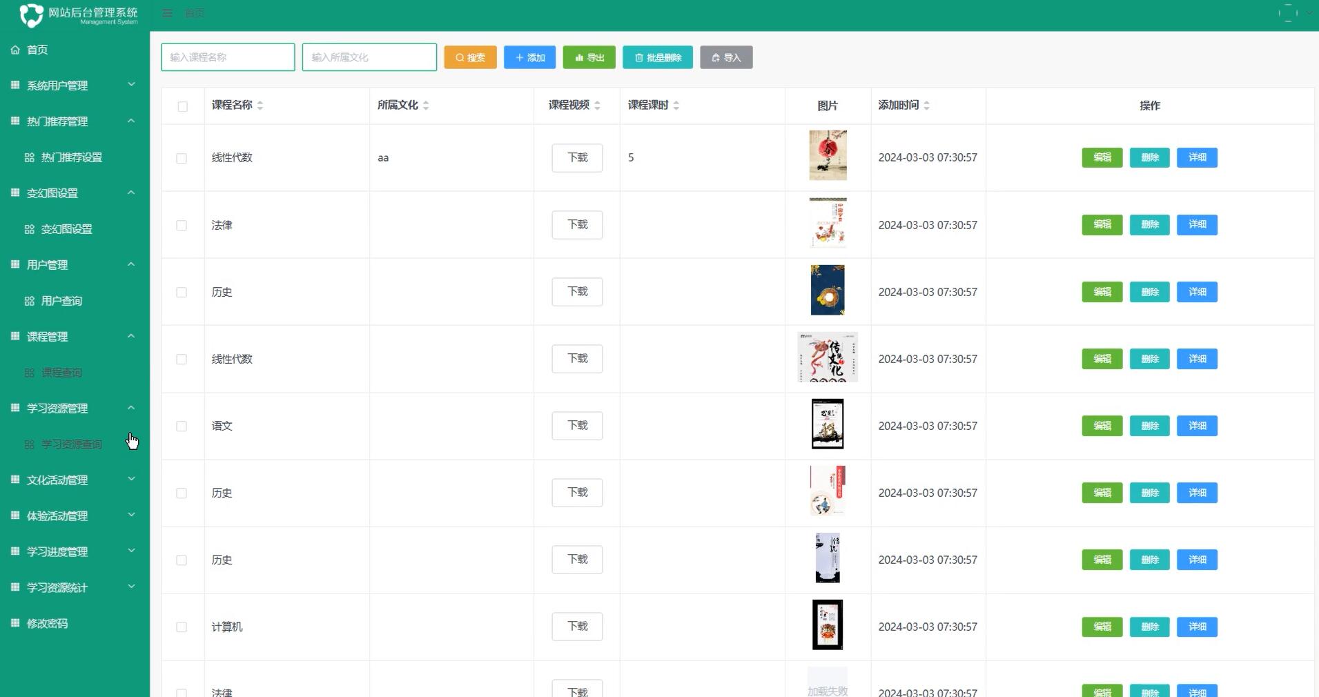 课程管理:实现课程的添加、编辑、删除和查询功能。课程信息包括课程名称、所属文化类别、课程视频、课程课时等。管理员可以对课程进行全面管理,用户可以根据所属文化类别或课程名称查询课程。