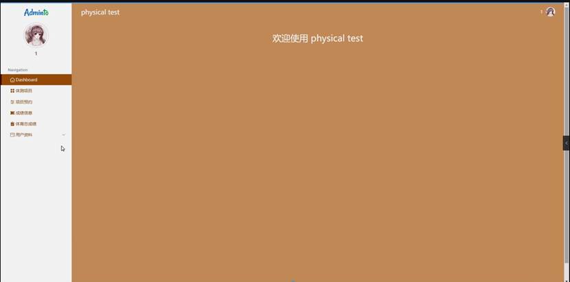 管理员进入主页面,主要功能包括对系统首页、学生、教师、项目类别、体测项目、项目预约、成绩信息、体育总成绩、用户资料等进行操作。管理员主页面如图5-2所示: