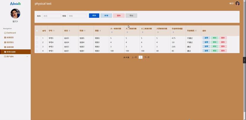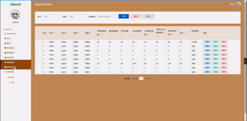 体育总成绩功能在视图层(view层)进行交互,比如点击“搜索、删除或导出”按钮或填写体育总成绩信息表单。这些体育总成绩表单动作被视图层捕获并作为请求发送给相应的控制器层(controller层)。控制器接收到这些请求后,调用服务层(service层)以执行相关的业务逻辑,例如验证输入数据的有效性和与数据库的交互。服务层处理完这些逻辑后,进一步与数据访问对象层(DAO层)交互,后者负责具体的数据操作如查看、修改或删除体育总成绩信息,并将操作结果返回给控制器。最终,控制器根据这些结果更新视图层,以便体育总成绩功能可以看到最新的信息或相应的操作反馈。体育总成绩界面如图5-9所示: