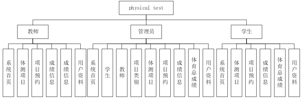 对本系统进行全面的系统功能的分析,可以得出physical test管理系统的功能模块图,如图4-1所示。