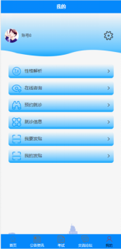 用户登录成功后,点击“我的”进入我的页面,在我的页面可以对个人中心、性格解析、在线咨询、预约就诊、就诊信息、我要发贴、我的发贴等进行详情操作。用户功能界面如图5-4所示。