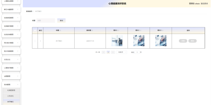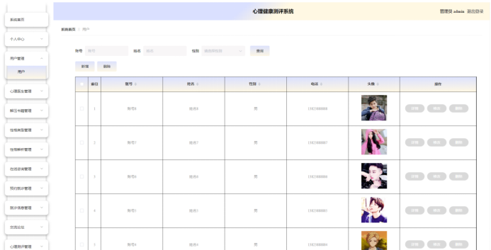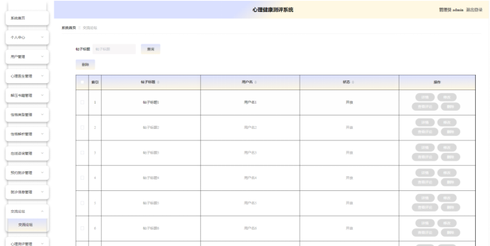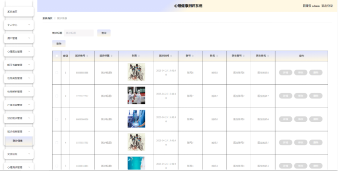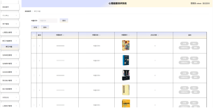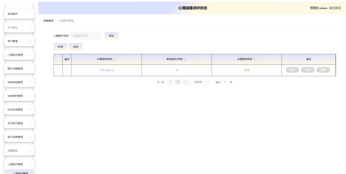 管理员点击心理测评管理。在心理测评页面输入心理测试名称进行查询、新增或删除心理测评列表,并根据需要对心理测评详情信息进行详情、修改或删除操作;如图5-20所示: