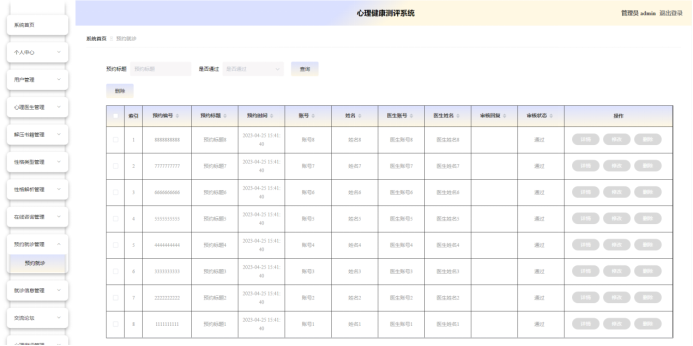 预约就诊管理:用户可以预约心理医生,管理员可以管理预约信息。