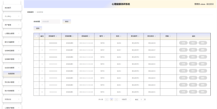在线咨询管理:用户可以发起在线咨询,管理员和心理医生可以回复咨询。