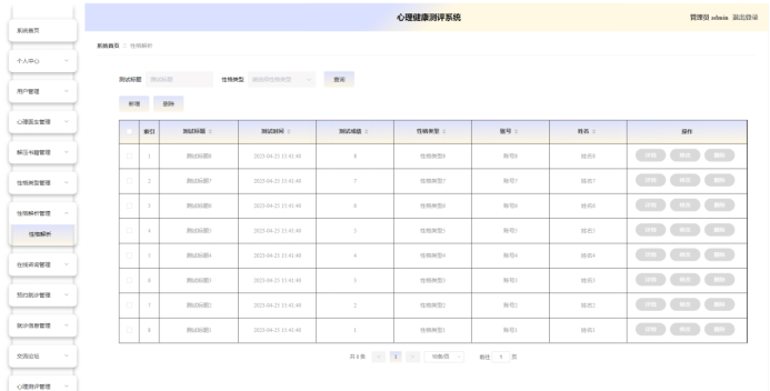 管理员点击性格解析管理。在性格解析页面输入测试标题、性格类型进行查询、新增或删除性格解析列表,并根据需要对性格解析详情信息进行详情、修改或删除操作;如图5-15所示: