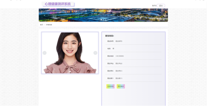 心理医生:在心理医生页面的输入栏中输入医生姓名、医生账号、性别、医生电话、医生专业、医生特长、医生简介进行查询,可以查看到心理医生详情信息,并根据需要进行在线咨询、预约就诊操作;心理医生详情页面如图5-6所示: