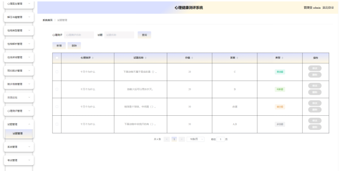 试题管理:管理员可以对测评试题进行新增、修改和删除操作。