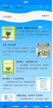 小程序首页是用户注册登录后进入的第一个界面,在这里,人们能够看到小程序的导航条,内容包括首页、公告资讯、考试、交流论坛、我的等。小程序首页界面如图5-3所示。