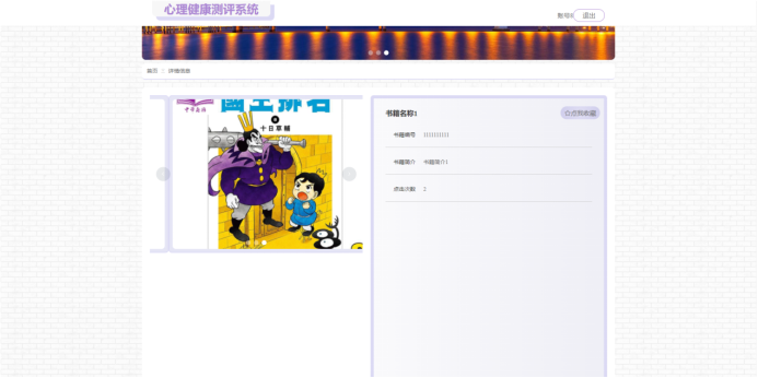 解压书籍:在解压书籍页面的输入栏中输入书籍名称、书籍编号、书籍简介、点击次数进行查询,可以查看到解压书籍详情信息,并根据需要进行收藏操作;解压书籍详情页面如图5-7所示: