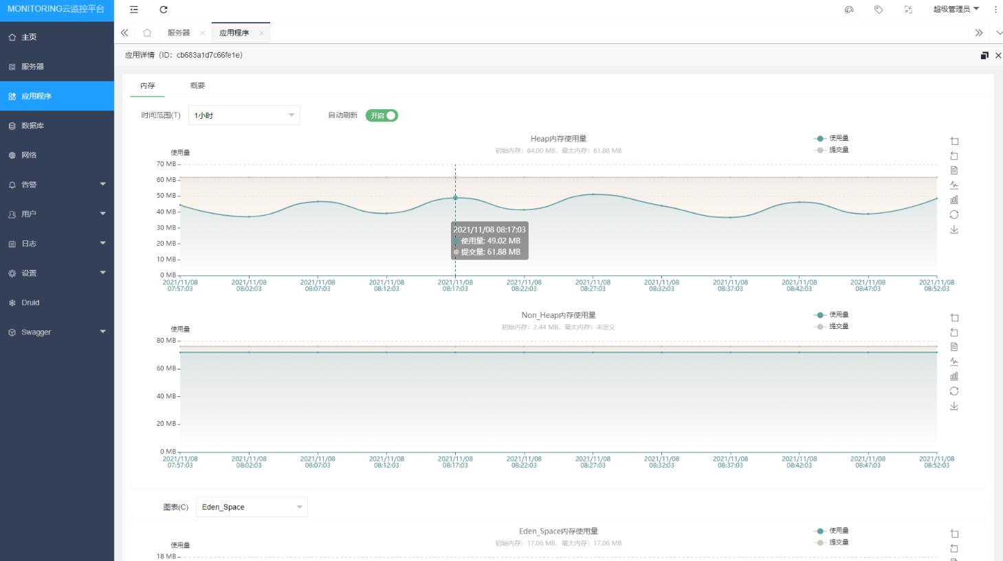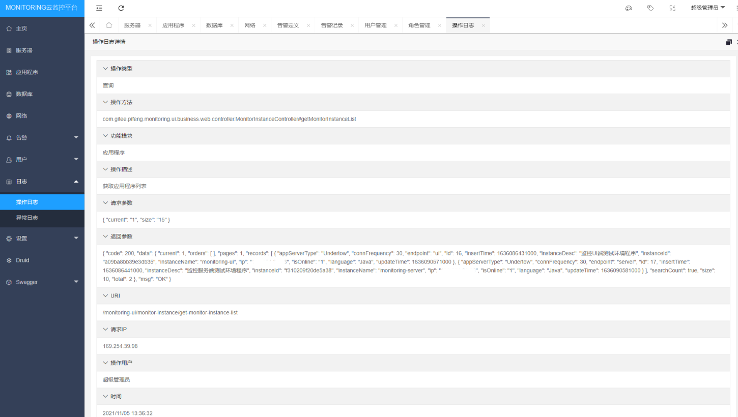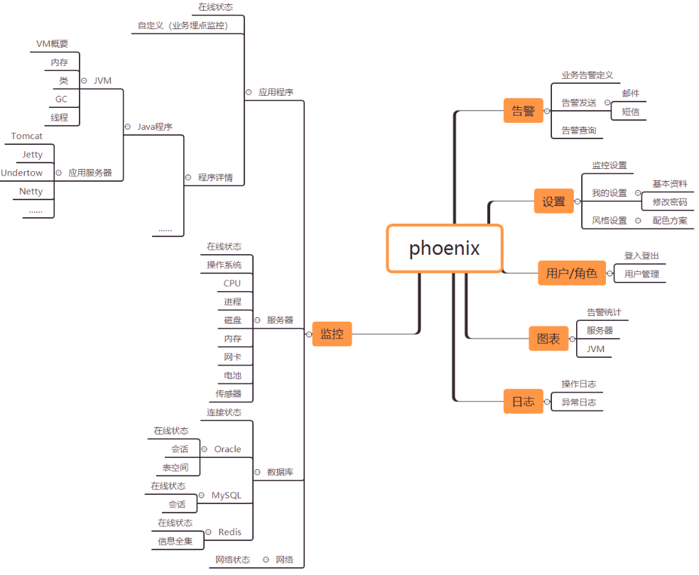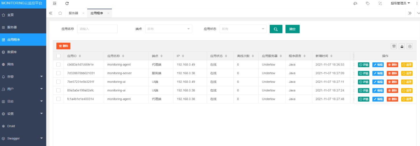 应用程序:默认支持Java应用程序,监控内容包括:在线状态、JVM、业务埋点。其它应用程序需要自己开发客户端,来调用接口与服务端或者代理端通信(心跳接口、服务器信息接口、告警接口);