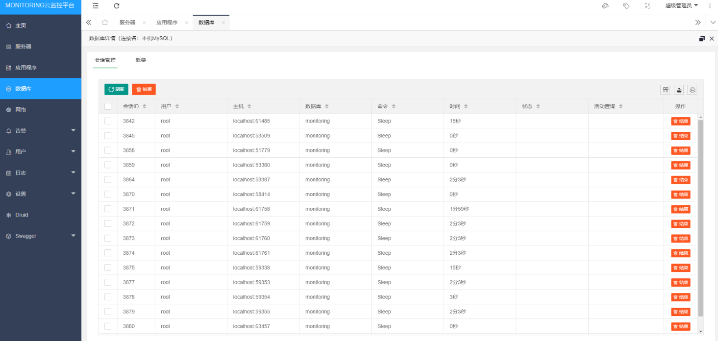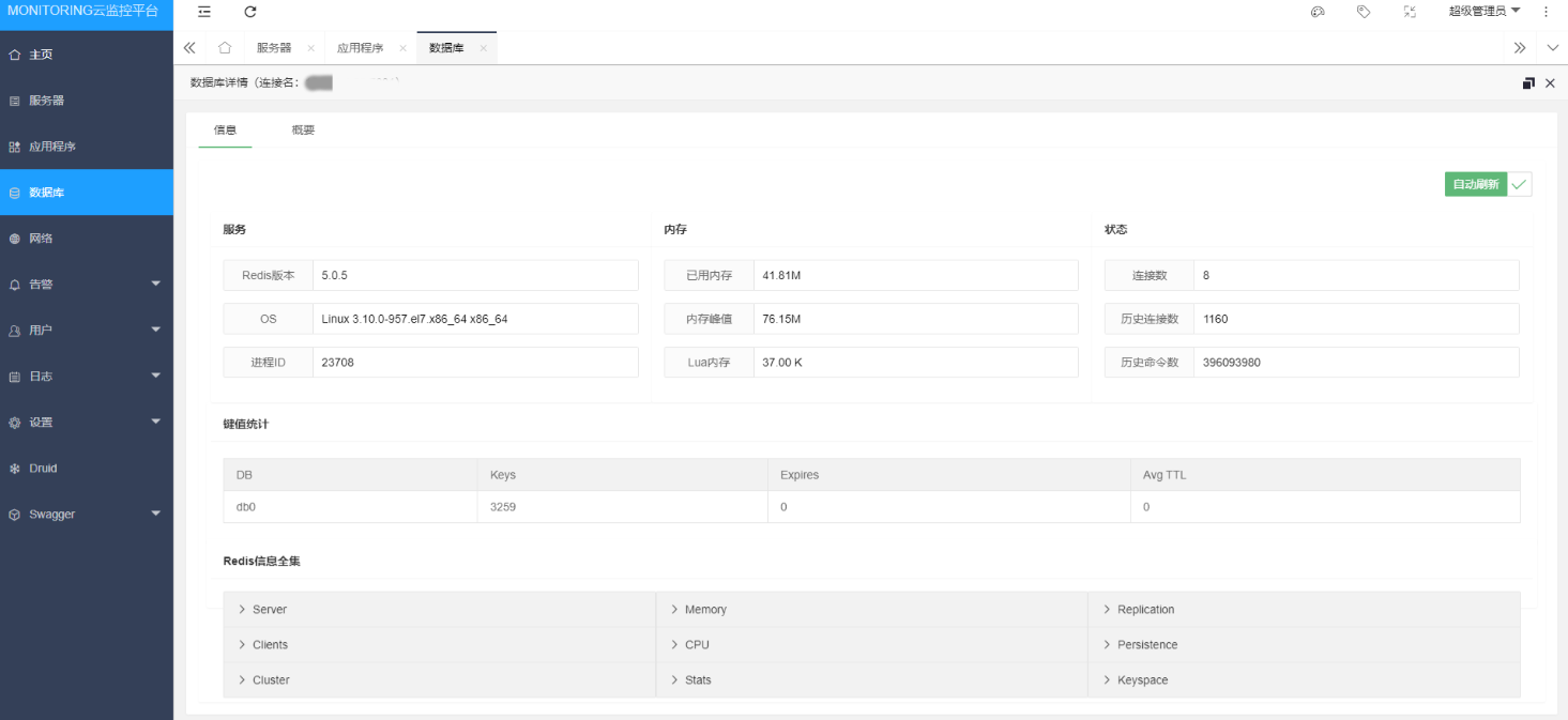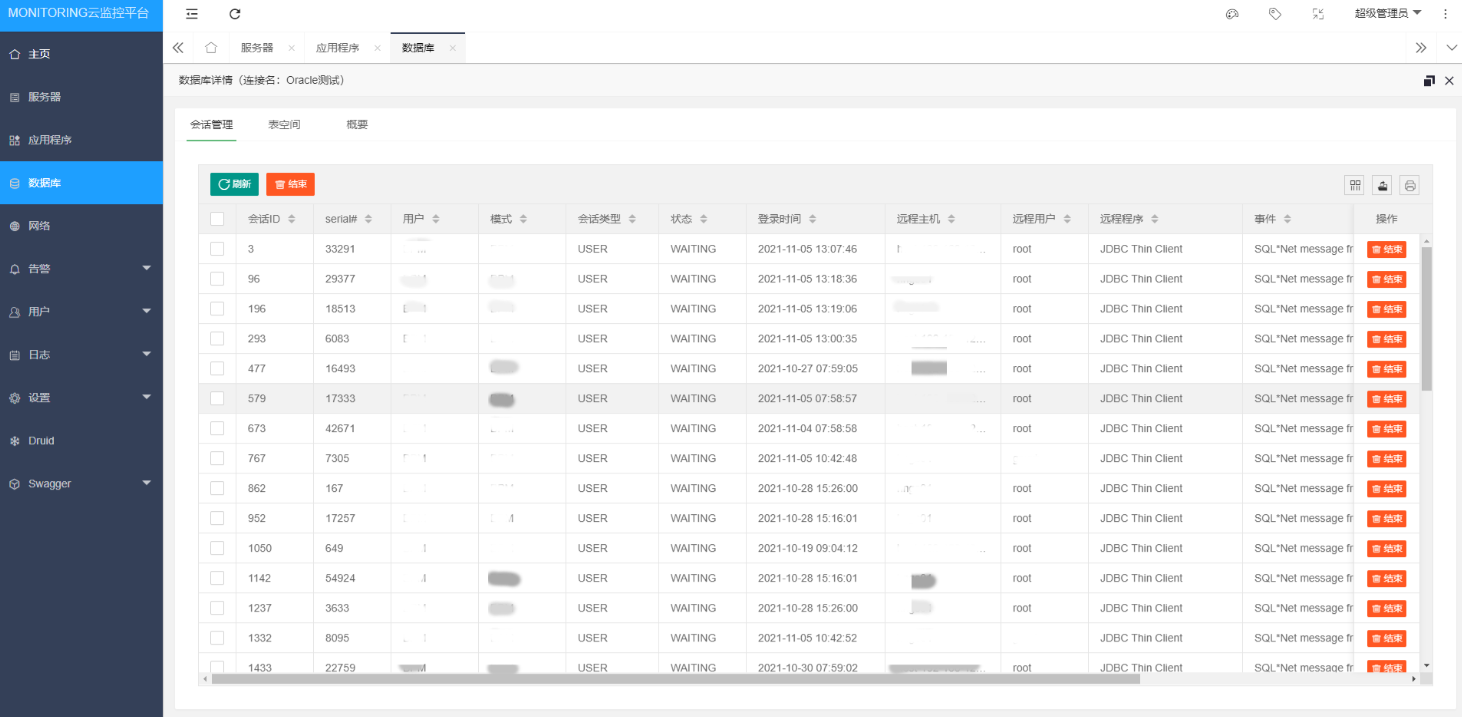 数据库:支持MySQL会话、Oracle会话与表空间、Redis信息全集;