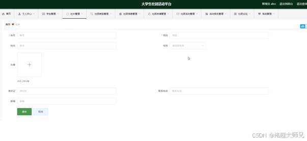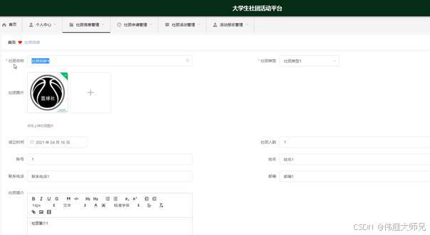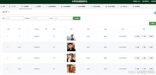 本文介绍了一个基于SpringBoot+vue开发的大学生社团管理信息系统。系统采用B/S架构和Mysql数据库,主要功能包括:管理员可进行学生、社团、活动的全面管理;会员可申请加入社团、参加活动;学生可浏览社团信息、参与活动。系统实现了前台展示与后台管理的完整流程,包含学生注册登录、社团申请、活动报名等核心模块。文中详细展示了系统界面效果图、数据库设计以及核心代码实现,为高校社团信息化管理提供了