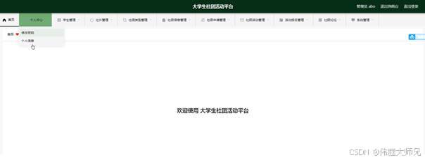 管理员在大学生社团活动平台页面可以查看首页、个人中心、学生管理、社团申请信息管理、社团管理、社团活动管理、会员管理、活动参与管理、会员申请管理、系统管理等。程序成效图如下图5-2所示: