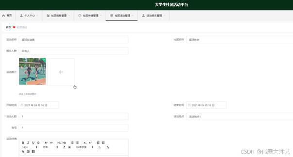 管理员对社团活动管理进行查看活动名称、活动类型、照片、举办日期、举办社团、活动地点、活动时长等信息并可以进行详情、删除、修改操作。程序效果图如下图5-6所示:
