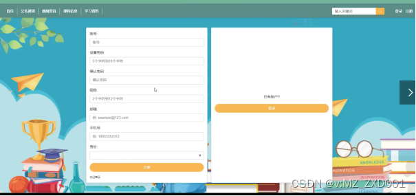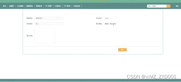 登录,在登录页面通过填写账号、密码等信息完成登录,如图5-3所示。心情笔记页面通过填写课程名称、学生姓名、笔记内容、学生用户、笔记类型等信息进行提交操作,如图5-4所示。