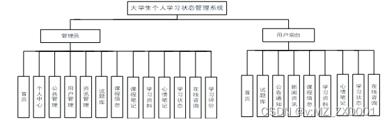 系统架构图属于系统设计阶段,系统架构图只是这个阶段一个产物,系统的总体架构决定了整个系统的模式,是系统的基础。大学生个人学习状态管理系统的整体结构设计如图4-2所示。