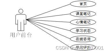 用户前台进入系统可以进行首页、课程笔记、心情笔记、学习状态、在线咨询、学习评价管理等。用户前台用例如图3-8所示。