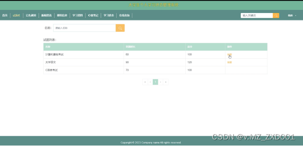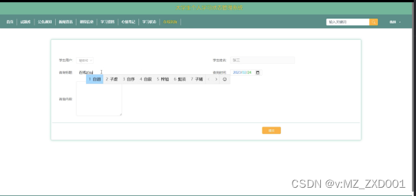 在线咨询,在线咨询页面通过填写学生用户、学生姓名、咨询内容,咨询标题、咨询时间等信息提交,如图5-5所示。试题库页面通过可查看试题名称、答题时长、总分等信息进行操作,如图5-6所示。