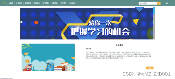 大学生个人学习状态管理系统,在系统首页可以查看首页、试题库、公告通知、新闻资讯、课程信息、学习资料、心情笔记、学习状态、在线咨询等内容,如图5-1所示。