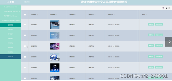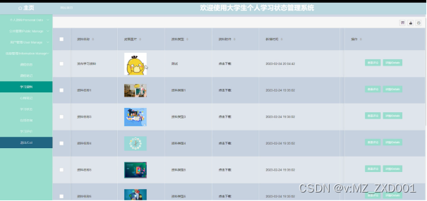 学习资料,在学习资料页面中可以查看资料名称、封面图片、资料类型、资料附件等内容,并且根据需要对已有学习资料进行详情,修改或删除等详细操作,如图5-12所示。