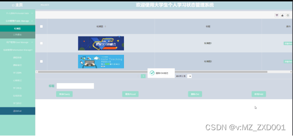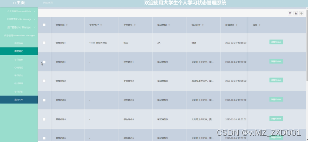 管理员登录进入大学生个人学习状态管理系统可以查看首页、个人资料、公共管理(轮播图、公告通知)用户管理(管理员、学生用户)信息管理(新闻资讯、资讯分类、试题库)课程信息、课程笔记、学习资料、心情笔记、学习状态、在线咨询、学习评价等信息。