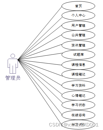 系统中的核心用户是系统管理员,管理员登录后,通过管理员菜单来管理后台系统。主要功能有:首页、个人资料、公共管理(轮播图、公告通知)用户管理(管理员、学生用户)信息管理(新闻资讯、资讯分类、试题库)课程信息、课程笔记、学习资料、心情笔记、学习状态、在线咨询、学习评价、系统管理等功能。管理员用例如图3-7所示。