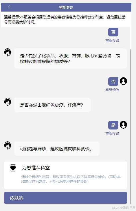 多轮交互:当症状描述模糊时,通过AI多轮追问补充信息,提高推荐准确性(如排除疑似疾病)。