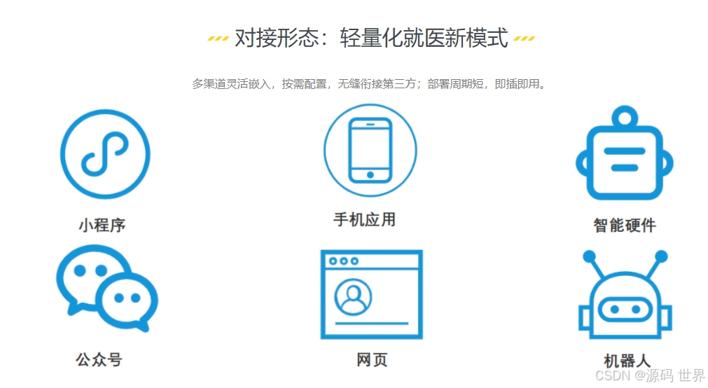 支持公众号、小程序、App、自助机、导诊机器人等多终端,兼容文字、语音、图像交互。