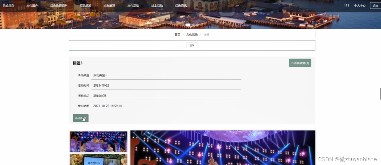 用户点击文化活动,在文化活动页面的搜索栏输入标题,进行查询,然后可以查看标题、活动类型、活动时间、活动地点、发布时间,还可以点击活动报名按钮、收藏或者评论操作;如图5.5所示: